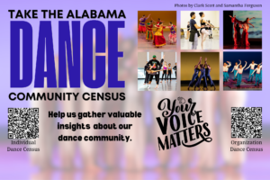 The Alabama Dance Census is a statewide effort to identify and connect the people, places, and practices that make up the rich and diverse dance community across our state. Whether you are a dancer, educator, choreographer, studio owner, arts administrator, student, or someone who simply supports dance — we want to hear from you.